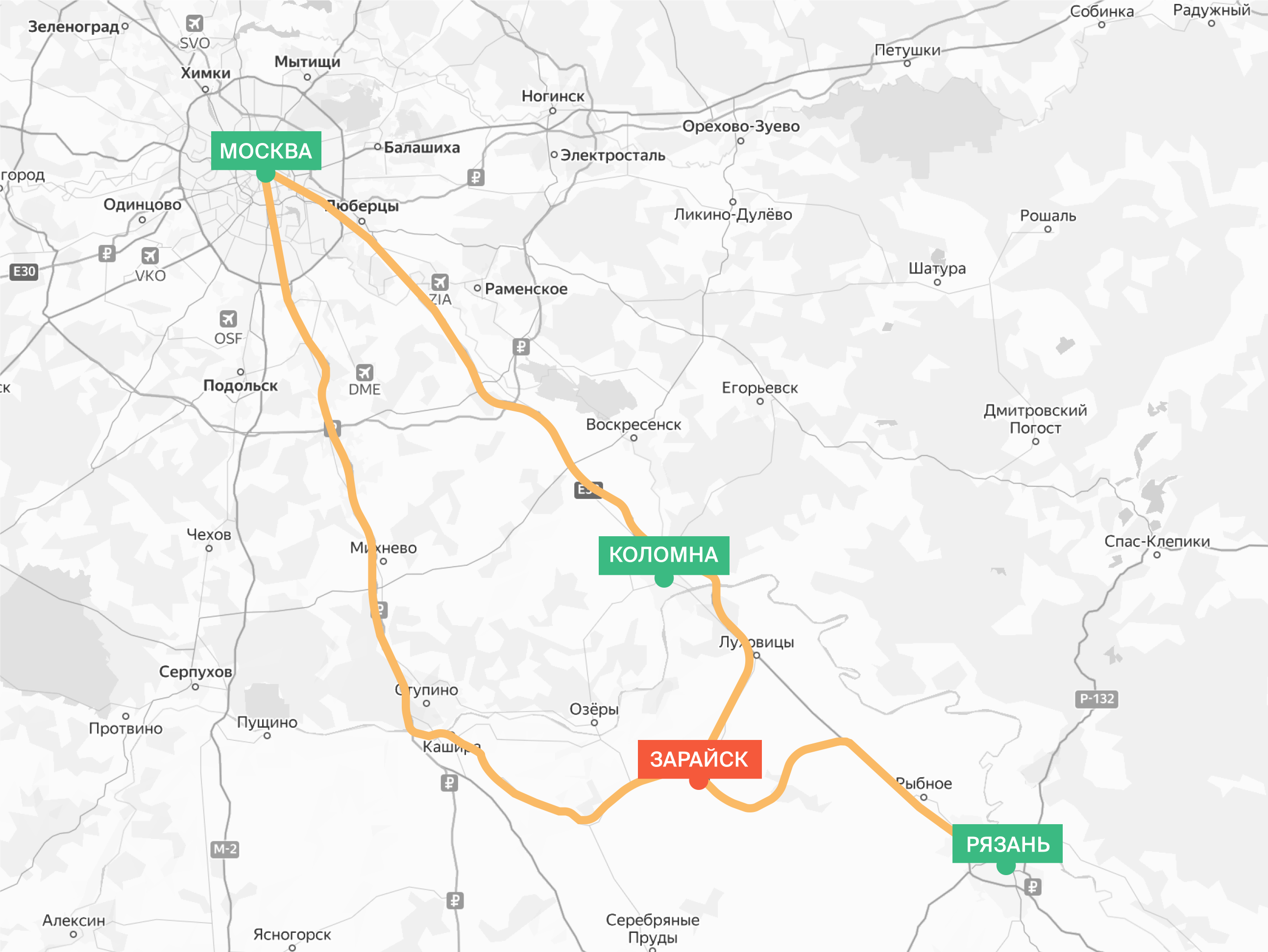 Маршрут строится по трассе М-5 (Новорязанское шоссе) через Луховицы либо по платной трассе М-4 «Дон» через Ступино.